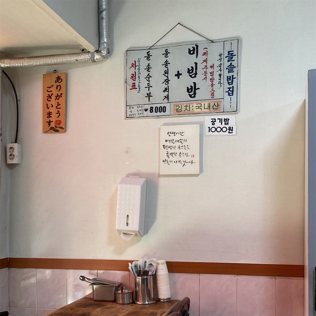 11時の開店直後に行ったのですが、既に半分ぐらいのお席が埋まっていました。ご近所の常連さんが多そう。これは期待が持てる…!メニューは潔くピビンバのみ、一緒に出てくる汁物としてテンジャンチゲかスンドゥブを選択できます。せっかくなので1つずつお願いしました。