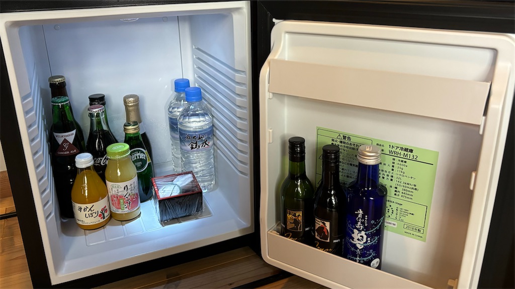 冷蔵庫の中の飲み物は全て料金に含まれています。日本酒だけでなく、ジュースも用意されていました。升の中に入っているのは酒粕で、こちらはお風呂に入れてくださいとのこと。